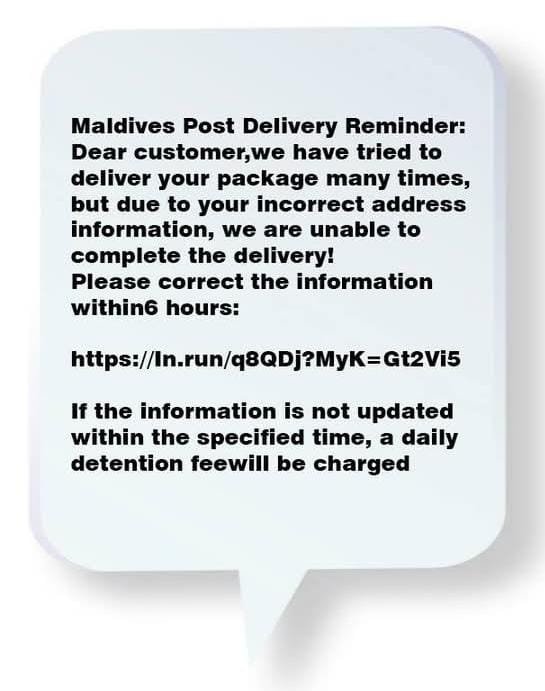 ޑެލިވަރީ އެޑްރެސް ރަނގަޅު ނޫންކަމަށާއި އަލުން އެޑްރެސް ފޮނުވައިދިނުމަށް އެދި، ލިންކެއް ހިމެނޭހެން ފޮނުވަމުންދާ މި މެސެޖަކީ އެ އޮފީހުން ފޮނުވާ މެސެޖުތަކެއް ނޫންކަމަށް މޯލްޑިވްސް ޕޯސްޓުން ވަނީ ބުނެފައެވެ.
