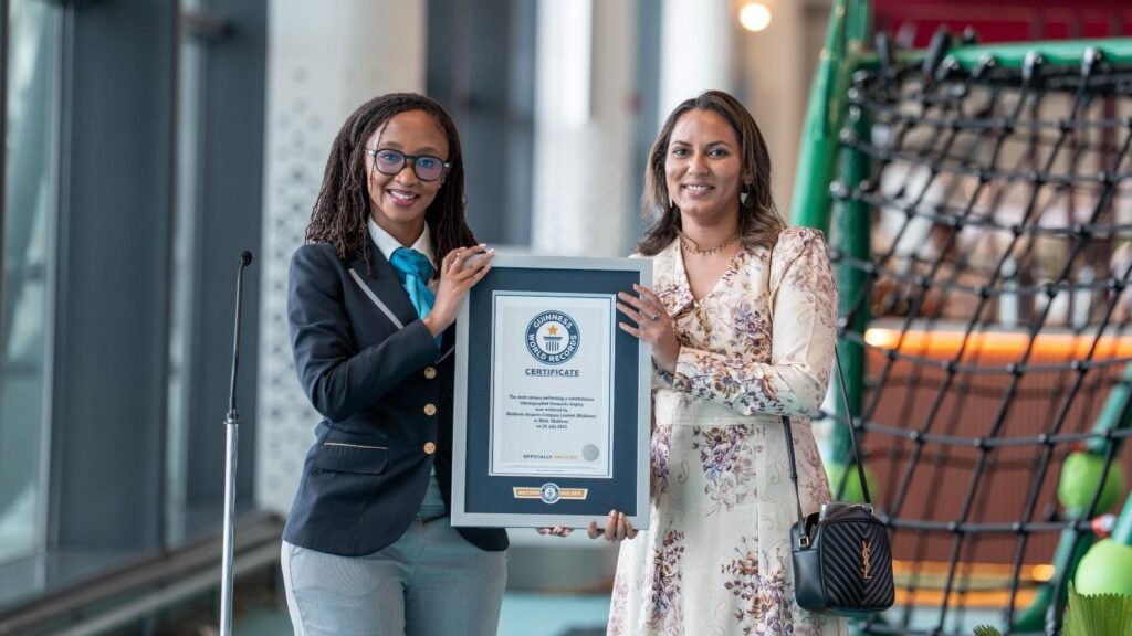 މިއަދު ބޭއްވި ރަސްމިއްޔާތެއްގައި އެމްއޭސީއެލްގެ ފަރާތުން ގިނަސް ވޯލްޑް ރެކޯޑްސްގެ ފަރާތުން ދިން ލިޔުމާ ހަވާލުވެވަޑައިގެންނެވީ މޯލްޑިވްސް އެއާޕޯޓްސް ކޮމްޕެނީ ލިމިޓެޑްގެ ޗެއާޕާސަން އައިޝާ ނޫރައިން ޖަނާހް އެވެ.
