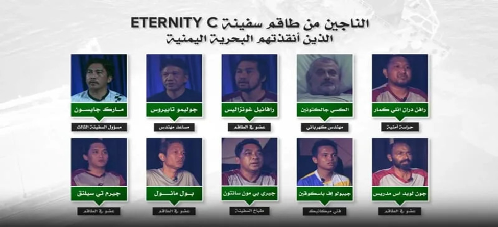 މި މަހު ކުރީކޮޅު ހޫތީ މުޖާހިދުން ދިން ހަމަލާގައި ރެޑްސީތެރެއަށް ފައްތާލި ގުރީކުގެ އެމް. ވީ. އެޓަރނިޓީ ސީ އު=ިން ކަނޑަށް ފުންމާލި ފަޅުވެރިންގެ ތެރެއިން ހޫތީ މުޖާހިދުން ސަލާމަތްކުރި 10 ފަޅުވެރިންގެ ވީޑިއޯ އެއް ހޫތީ މުޖާހިދުންގެ ފަރާތުން 28 ޖުލައިގާ މީޑިއާއަށް ހާމަކޮށްފިއެވެ. ހޫތީ މުޖާހިދުން ދައްކަންބޭނުންވަނީ އިސްރާއީލުން ކިތަންމެ ބާރުގަދަ ހަމަލާތަކެއް ޔަމަނަށް ދިން ކަމުގައި ވިޔަސް އެ ޖަމާއަތުގެ ވިސްނުމަށް ބަދަލެއް ނާންނާނެ ކަމެވެ.
