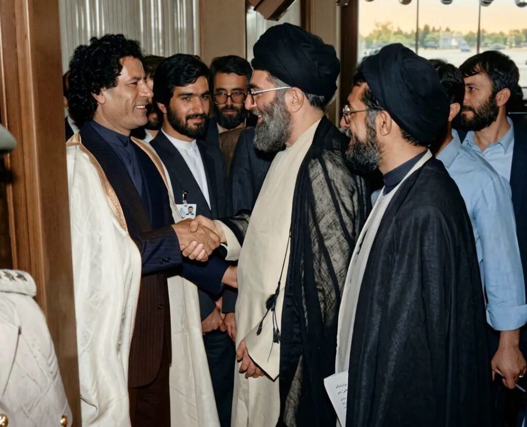 އެ ފޮޓޯއިން ދެން ފެންނަ ލީޑަރަކީ ލީބިޔާގެ މަރުހޫމު ގައްޛާފީއެވެ. އޭނައަކީ އެ ދުވަސްވަރު އަރަބި ގައުމިއްޔަތުގެ ޖުއްބާލައިވައިގެން، އަރަބި ދުނިޔޭގެ ލީޑަރަކަށް ވުމަށް މަސައްކަތްކުރެއްވި ބޭފުޅެކެވެ. އާދެ، އީރާނުގައި އޭރު އޮތް ދީނީ ޝީއީ ސިޔާސީ ނިޒާމާއި މުޅިން ފުށު އަރާ ގައުމީ ފަލްސަފާއެއްގެ ވެރި ބޭކަލެކެވެ.